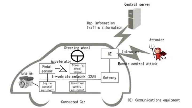 En los últimos años, los automóviles conectados a redes externas, como Internet, están aumentando en número y el desarrollo tecnológico destinado a crear nuevos servicios, incluidas capacidades mejoradas de seguridad y conducción autónoma, está en curso. Pero se observa que existe el peligro de que puedan ser controlados remotamente por un cíber-ataque. Al enviar mensajes a través de la red del vehículo, conocida como controller are network (CAN), el comportamiento de los sistemas del automóvil y sus operaciones pueden ser controladas. Un atacante que ejecuta este control remoto en el sistema, puede secuestrar su equipo de comunicaciones y la puerta de enlace que se conectan a la red externa y envíar mensajes CAN maliciosos. Como resultado, los atacantes podrían hacer que el coche haga cosas en contra de los deseos del conductor, incluyendo la aceleración o el frenado repentinos, lo cual puede llevar a causar accidentes graves.