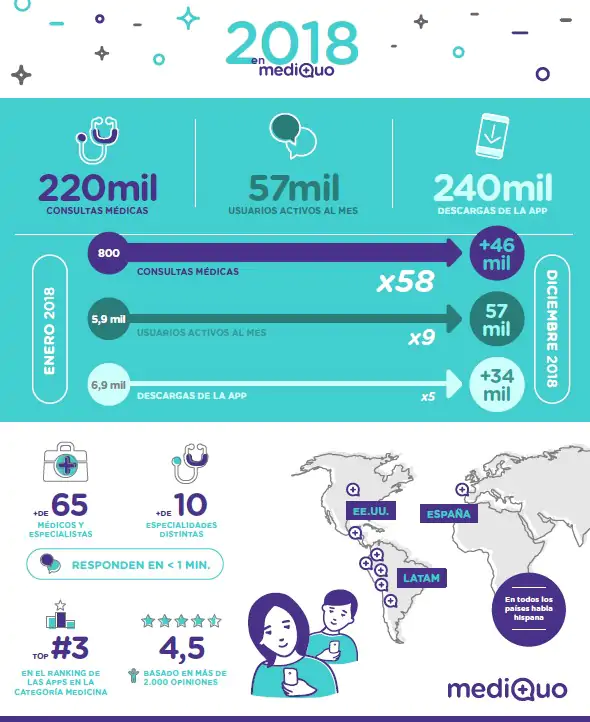 MediQuo comenzó su andadura en enero de 2018 con tan sólo 800 consultas médicas y en diciembre del mismo año ya alcanzaba las 46.500 consultas realizadas. Lo que significa que se multiplicaron por más de 50, alcanzando un total de 220.000 consultas realizadas en un año. Asimismo, mientras que en el mes de enero el número de descargas era de 6.900, en diciembre ya sumaban 34.500, 5 veces más. En total, mediQuo alcanza la cifra de más de 240.000 descargas.Además, en enero del mismo año, mediQuo contaba con tan solo 5.900 usuarios activos. Actualmente, mediQuo cuenta con más de 57.000 usuarios activos al mes y más de 24.000 visitas mensuales al blog, donde se publica contenido médico, de salud y de bienestar a diario. La aplicación tiene una valoración de 4,5 estrellas sobre 5 y el 90% de los usuarios está satisfecho o muy satisfecho con el servicio recibido.