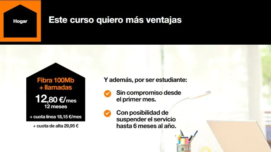 Orange ha iniciado la comercialización de una oferta diseñada para cubrir las necesidades de comunicación fija (fibra o ADSL + llamadas) de estudiantes de estudios superiores que inician en septiembre un nuevo curso académico. Esta oferta es válida para estudiantes españoles que se desplazan fuera de su ciudad o estudiantes extranjeros, que necesitan una conexión de calidad y de alta velocidad tanto para sus estudios como para seguir conectados con los suyos a un precio competitivo.
